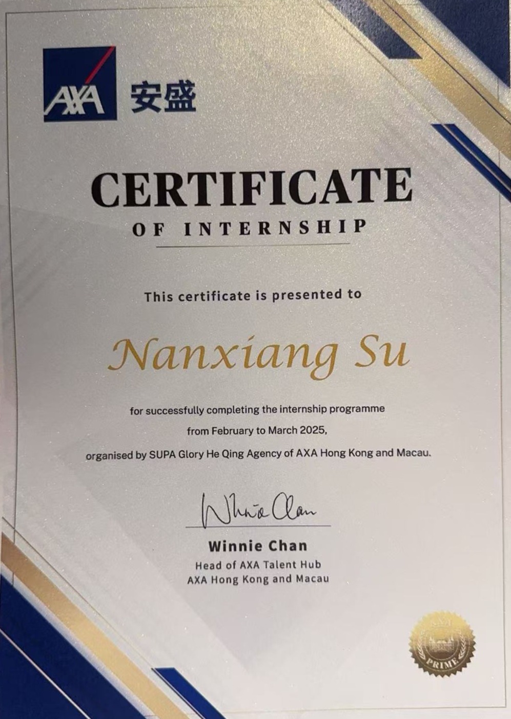 蘇楠翔曾在香港安盛保險實習