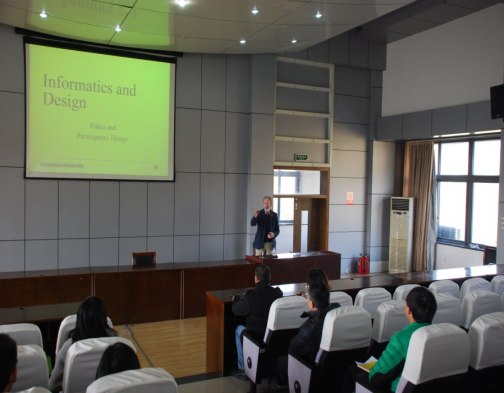 Jeff Winter副教授從“當你想到設計、開發和使用信息交流系統的時候你首先想到的是什么?”引出主題,闡述了系統分析和開發、交互設計/用戶為中心設計,圍繞技術與變革、技術與分析能力、大數據時代中如何進行道德評價等方面作了詳細介紹,并就師生們在實際運用中遇到信息技術問題進行了互動交流。